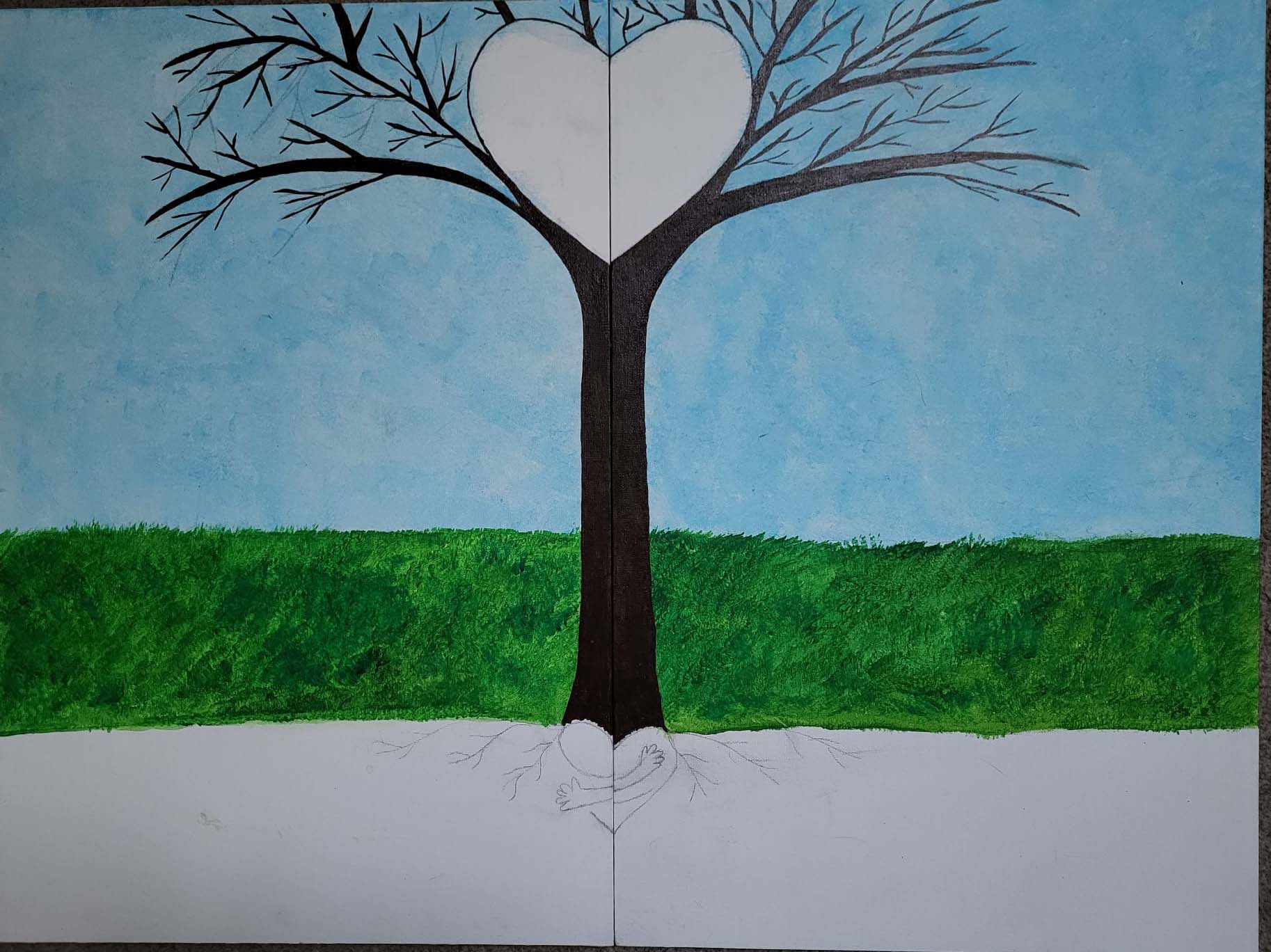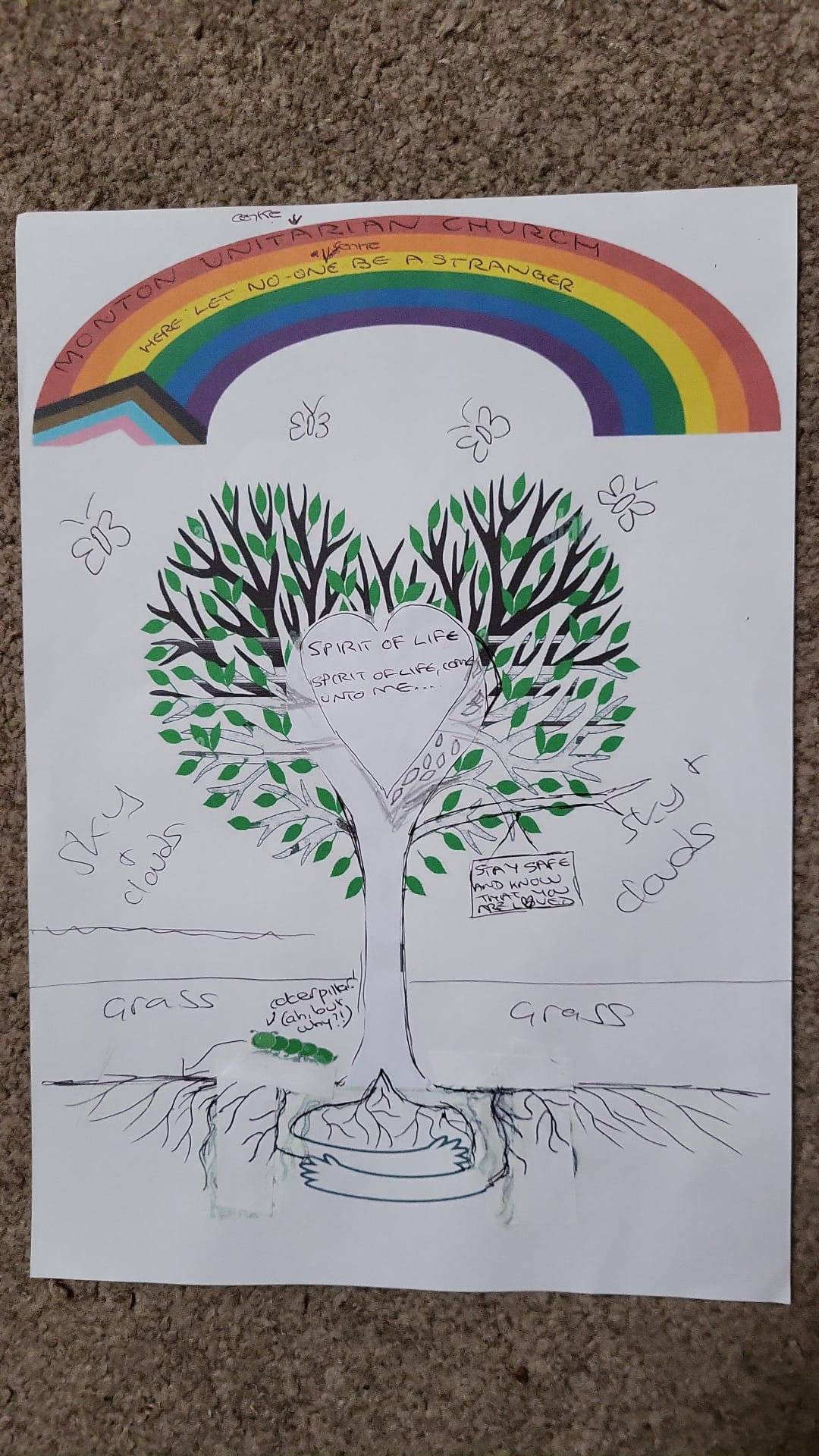 Outline of the "Tree of Life" At the heart of the Unitarian faith is the hymn "Sprit of life" By Carolyn McDade (1981) which includes the words "ROOTS HOLD ME CLOSE" (the heart hug at the base of the tree)